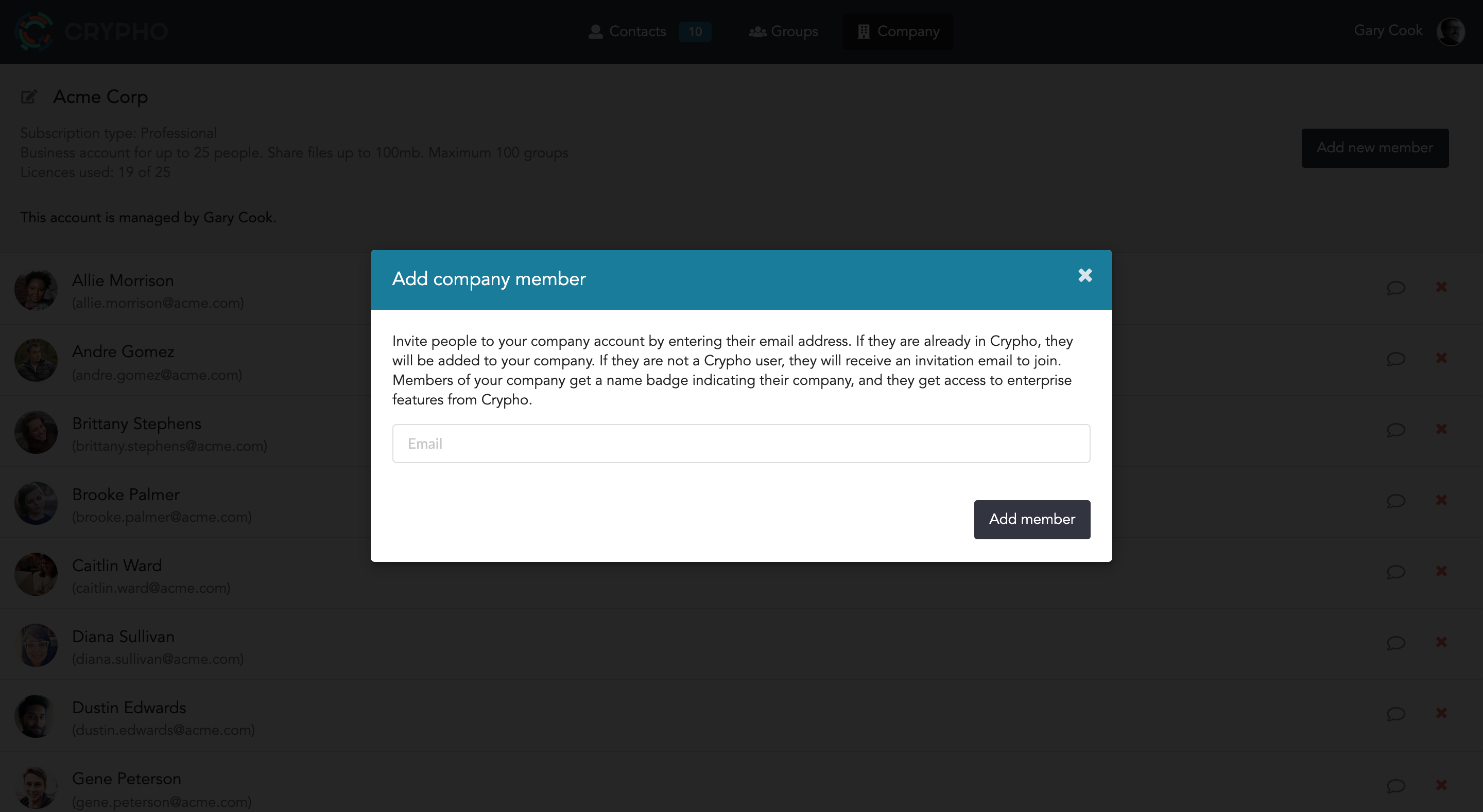 Crypho offers a paid version for organizations and companies. It offers useful features for managing many users and company compliance.